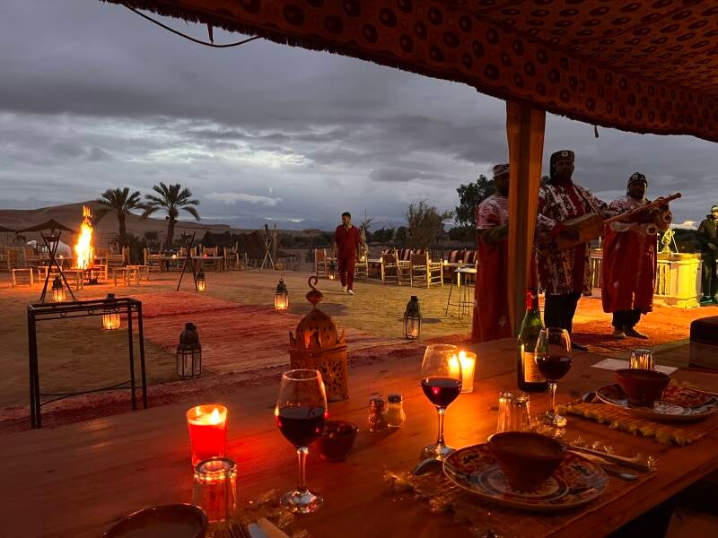 Via Agafay Experience boekten wij online een “dinner-spectacle”. Zij regelen ook het vervoer heen en terug. Al bij al een leuke avond maar zoals gezegd zeer toeristisch en weinig authentiek.