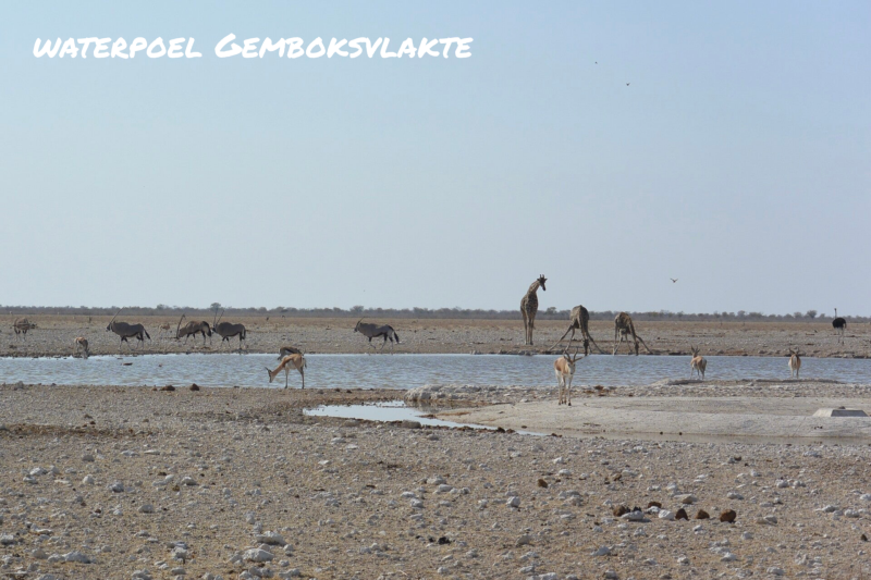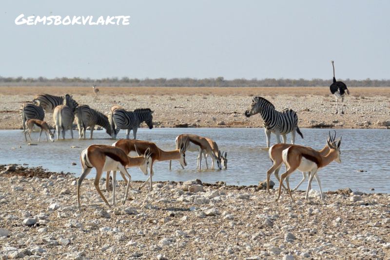Gemboksvlakte ligt op 15 kilometer van Okaukuejo en is een kunstmatige drinkplaats. Het trekt enorm veel zebra’s, giraffen, kudu’s en soms olifanten en leeuwen aan. We bleven er een hele poos kijken, de hele tijd kwamen nieuwe kuddes dieren op en af gelopen.