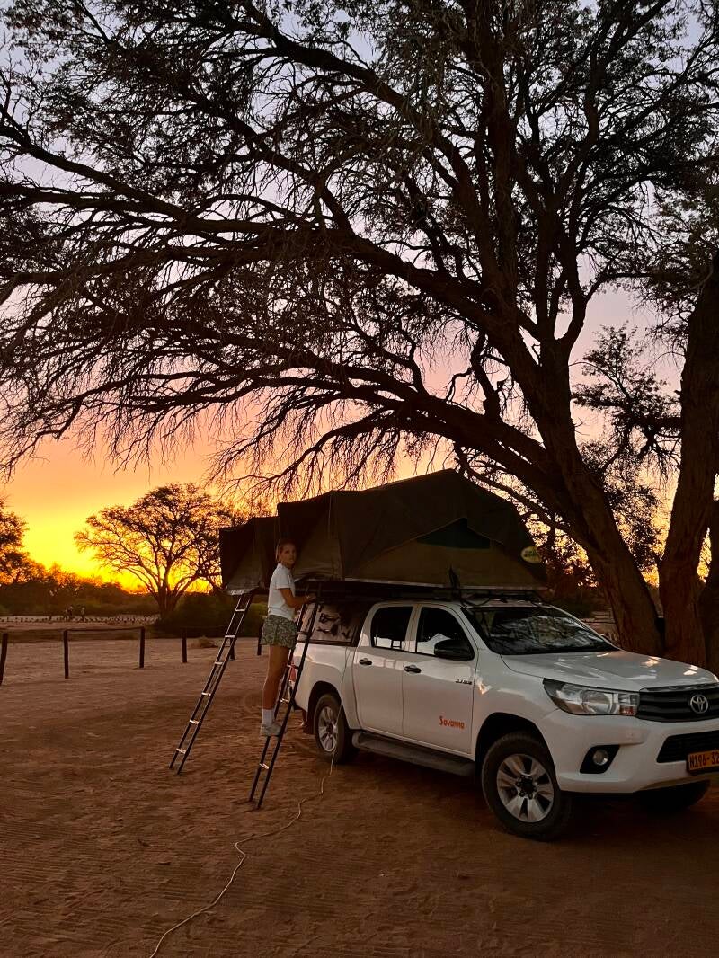 We huren uiteindelijk een Toyota Hilux met 2 daktenten en complete kampeeruitrusting via Savannah Car Hire. Zij zorgen voor luchthaventransfers en de permit voor de grensovergang naar Botswana. We nemen de best mogelijke verzekering. Alles bijeen komt dat op een huurprijs van 143€/dag (prijs 2023). Wij reden gelukkig geen lekke banden, maar 2 reservebanden zijn zeker een must.
