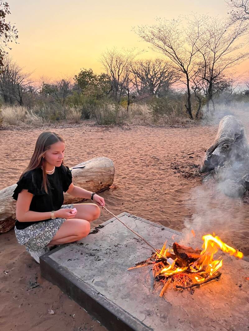 We houden halt bij de stokstaartjes en dan komen we aan bij de slaapplek, midden de zoutpan. We genieten van een lekkere bbq, reisverhalen bij het kampvuur en de nacht is winderig maar heerlijk warm in de “bedrolls”. Met bush baby (warmwaterkruik).