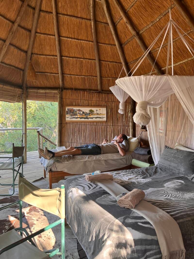 Lodges zijn fantastisch maar (erg) duur. In Botswana, waar massatoerisme vermeden wordt, zelfs peperduur… en meestal maar voor 2 personen. Kinderen (+12) tellen mee als volwassenen. Bij veel campsites zijn ook lodges/tenten, dus budgetgewijs wisselen we het slapen in de daktenten van de jeep, af met glamping in safaritenten.