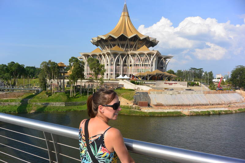 Op het plein voor ons hotel is een voetbaltoernooi aan de gang en we snuisteren wat rond in de hippe winkeltjes in de buurt. Het is bloedheet, dus zwemmen we eerst vooraleer we op stadswandeling vertrekken. Het is verbazend ontspannend en rustig in de stad. Langs Kuching Waterfront is het echt aangenaam vertoeven, er zijn veel eetkraampjes.