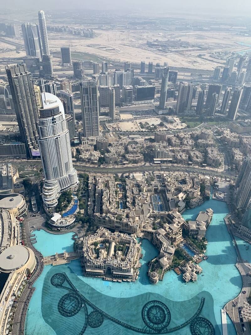 We lunchen in de mall (buiten op het terras bij de fontein show). We zijn overdonderd door de hoogte van de Burj Khalifa maar ook door de hitte. Stipt om 14h30 staan we klaar om met de supersnelle lift, 456 meter hoog naar het observatieplatform te gaan. Hiervoor had ik tickets op voorhand besteld (en laten printen in het hotel). Het uitzicht is uiteraard fenomenaal.