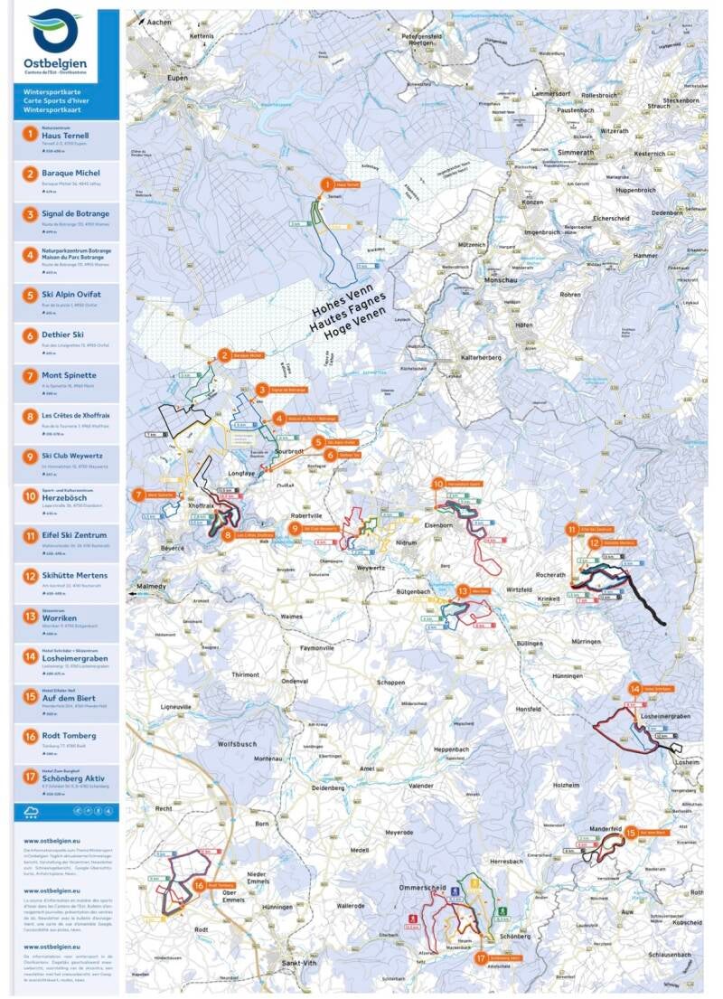 Een goed overzicht van alle wintersportgebieden in de Hoge Venen en de Eifel-Ardennen vind je hier. Je vindt er actuele informatie over de sneeuwkwaliteit, toestand van de pistes en materiaalverhuur.