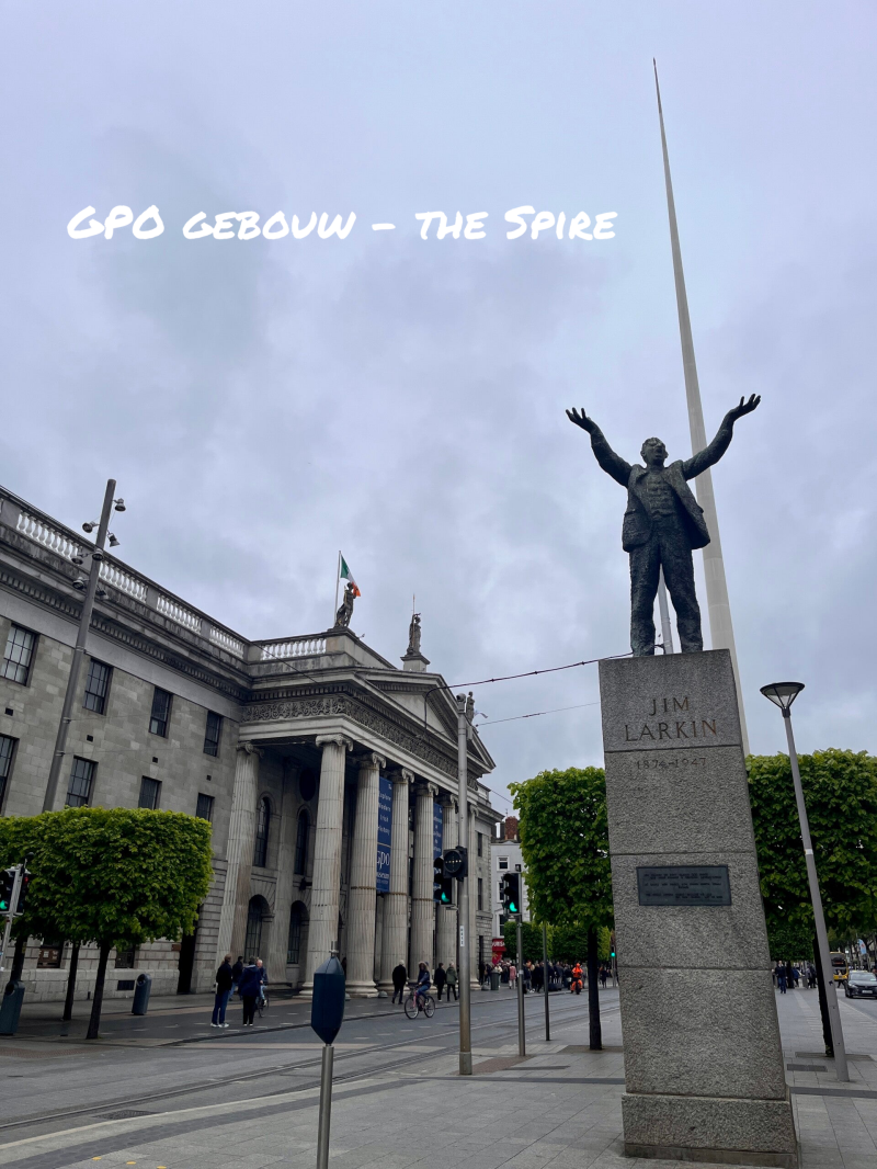 Hier vind je het G.P.O., General Post Office, een gebouw in neoklassieke stijl, dat dienst deed als hoofdkwartier van de Paasopstand van 1916. Deze lag aan de grondslag van de Ierse Republiek en nog steeds spelen politieke manifestaties zich hier af.