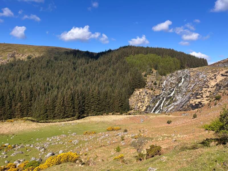De Powerscourt Waterfall ligt ongeveer 7 km zuidelijker in de Wicklow Mountains. Parkeren is betalend. Dit is de hoogste waterval (121 meter) van Ierland!