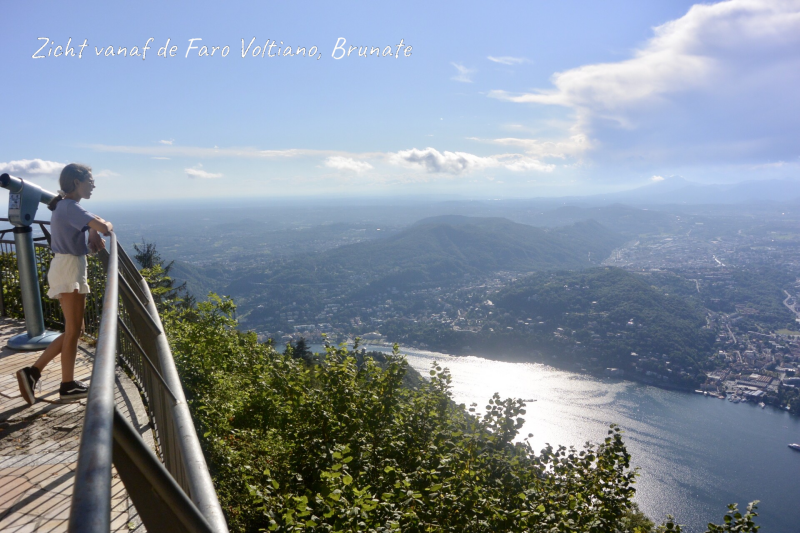 Vanaf het hotel en het mooie kerkje van Brunate klimmen we nog anderhalve kilometer hoger, naar de vuurtoren van Brunate, Faro Voltiano. Hoger kunnen we nu niet meer en het uitzicht is werkelijk fantastisch.