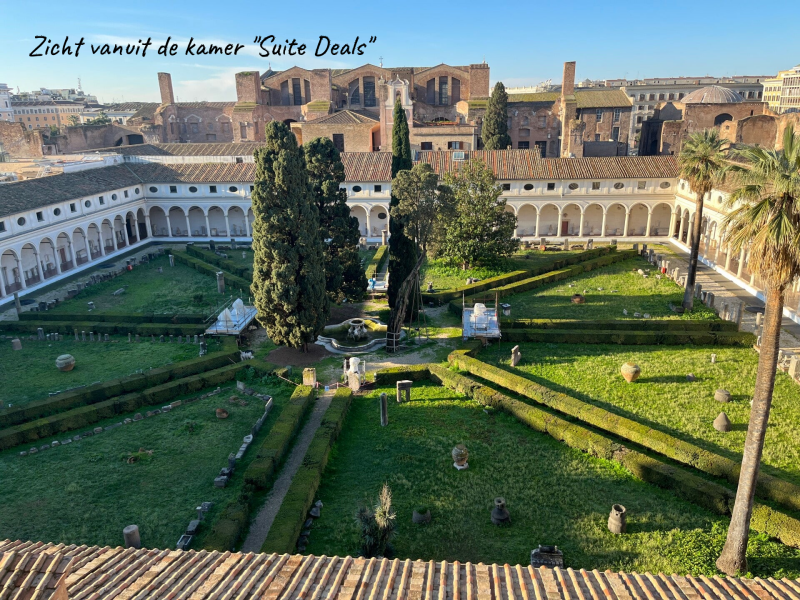 We verblijven in een uitstekende 3 persoonskamer bij hotel/guesthouse Suite Deal. De ligging, op 600 meter van het Termini station en nabij het metrostation Repubblica, is ideaal. Het guesthouse zit in een herenhuis en vanuit onze kamer hebben we een prachtig zicht op het klooster van Michelangelo, in het National Museum of Rome met de thermen van Diocletianus uit de Aureliaanse periode.