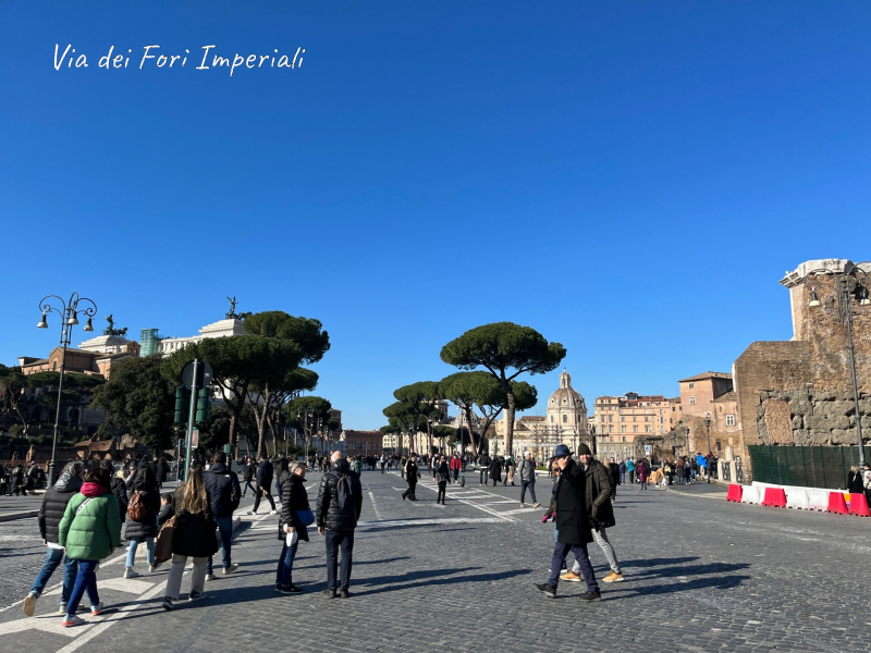 Op deze zondag is het heerlijk slenteren langs de verkeersvrije Via dei Fori Imperiali waar straatartiesten zorgen voor vertier. We wandelen richting het Piaza Venezia en we blijven maar Keizerlijke Fora passeren. Eerst dat van Nerva, dan het Forum van Augustus (2 v.Chr.) en tenslotte dat van Trajanus. Tegenover het Piazza Venezia staat de goedbewaarde zuil van Trajanus.