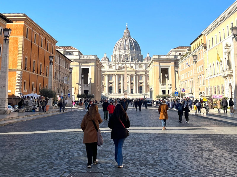 Het Sint-Pietersplein is enorm groot en overweldigend. De imposante Sint-Pietersbasiliek is één van de mooiste gebouwen van Rome.