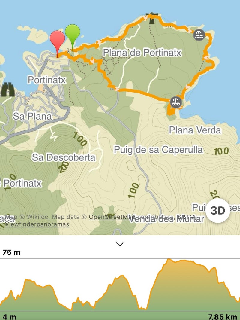 Vanaf het parkeerterrein bij het haventje van Portinatx, start een mooie wandeling naar de vuurtoren, Far des Moscarter. De hele lus is ongeveer 8 kilometer lang. Je loopt het eerste deel langs de klif tot aan de vuurtoren, het pad is gemarkeerd.