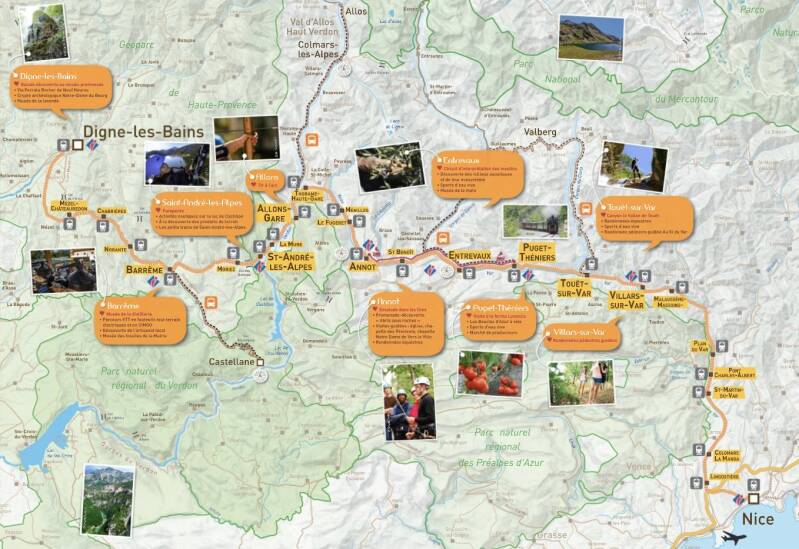 Onderweg is het mogelijk om uit te stappen in één van de 28 stationnetjes. De middeleeuwse dorpjes Villars-sur-Var, Touët-sur-Var, Entrevaux (één van de dorpen van Frankrijk met het label ‘Les Plus Beaux Villages de France’) en Annot zijn een hoogtepunt.