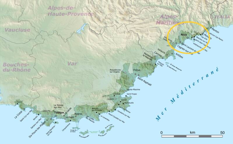 Kaart ligging Nice aan de Côte d’Azur, Frankrijk