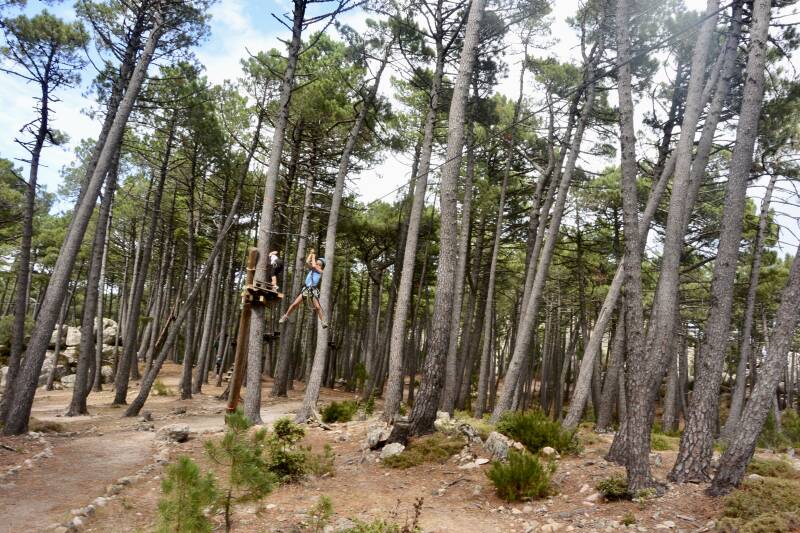 Wij keren terug naar het meer van Ospédale, naar het Xtreme Sud Parc. Hier kan je verschillende behendigheidsparcours (tot heel moeilijk) doen en er is ook een mooi stuk via ferrata. De meisjes en ikzelf wagen ons aan een hele leuke klim- en klauterpartij terwijl de papa foto’s maakt vanop de veilige begane grond (hoogtevrees weet je wel…).