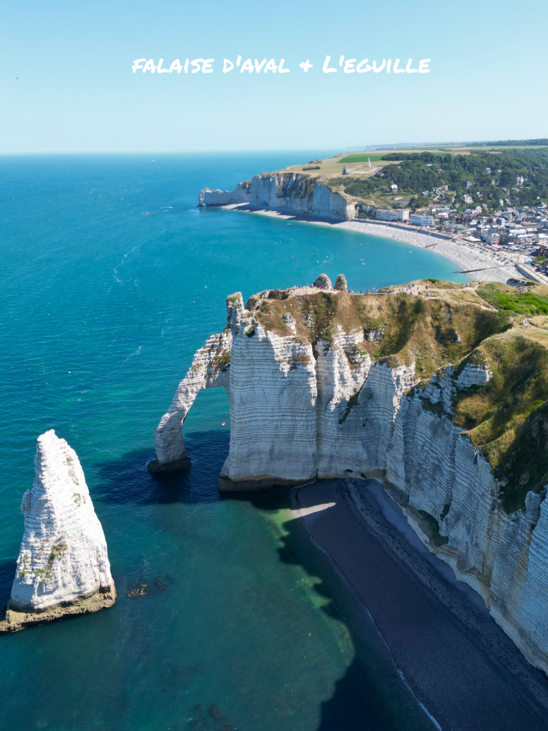 Vanaf het strand in Étretat zijn twee bogen te zien. De Falaise d’Aval met L’Aiguille, de naaldrots , aan de linkerkant (als je naar zee kijkt) en de Falaise d’Amont als je naar rechts kijkt. De trappen en het pad ernaartoe zijn vrij steil.