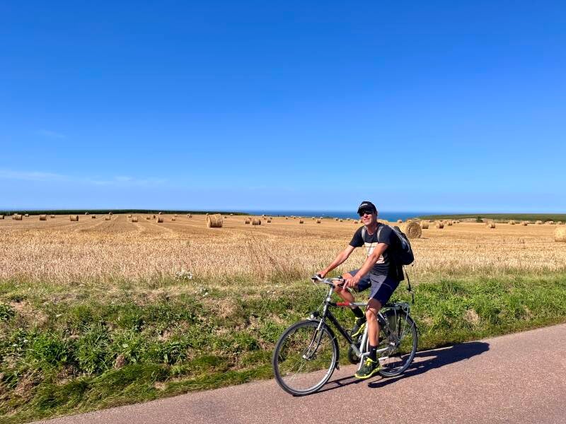 Je komt langs kleine dorpjes, waar de haan mag kraaien, de geraniums uitbundig bloeien en de hagen strak geschoren zijn. Verder langs eindeloze mais-, tarwe- en gerstvelden, akkers waar het vlas ligt te drogen en weiden vol grazende koeien. En de zee is nooit veraf.