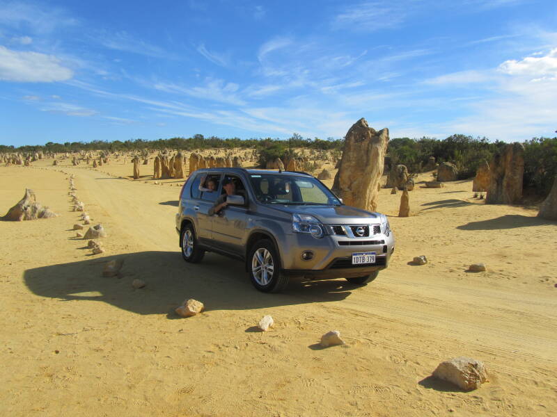 Via golvende wegen met prachtige vergezichten op de kust en de zandduinen van Lancelin, komen we bij het Nambung NP aan. Hoogtepunt hier zijn de Pinnacles, door de natuur gevormde zandsteentorens, soms wel tot 5 meter hoog. Het is een uniek fenomeen en ideaal voor een spel verstoppertje. We rijden de Pinnacles Loop door het zand tussen de pilaren.