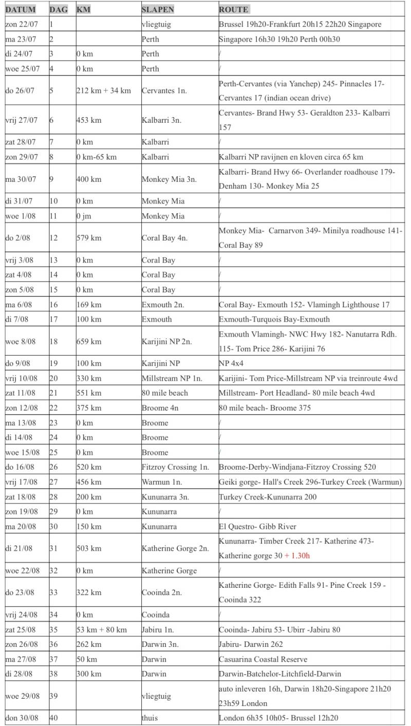 Via Brussel, Frankfurt en Singapore gaat het naar Perth. Het is sowieso een reis van meer dan 24 uur. De vlucht naar Singapore duurt 12 uur en naar Perth is het nog eens 5 uur vliegen. De terugreis is iets korter omdat we vanuit Darwin al vlakbij Azië zitten.