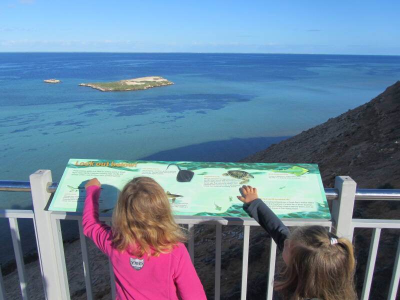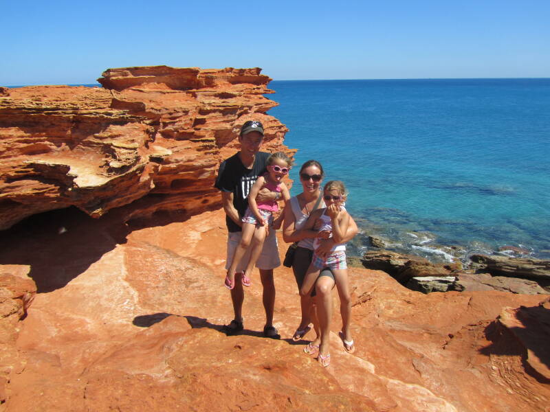 Vanuit Broome gaan we de oceaan op om walvissen te spotten. Eerst pikken we nog een lookout mee, bij Gantheaume Point, een rotspunt in zee waar dino footprints te zien zijn bij laagtij. Zara en Enna denken er wel honderden te zien.