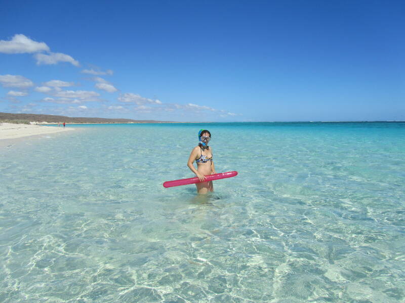 Daarna gaan we snorkelen op een toplocatie, bij Turquoise Bay. De snorkeldrift is hier erg geliefd. Je gaat het water in, laat je meedrijven met de stroom over het koraal, en 300 m verder stap je weer uit het water. Magnifiek! Ons onderwatertoestel heeft het helaas begeven dus geen foto's van al dat moois.