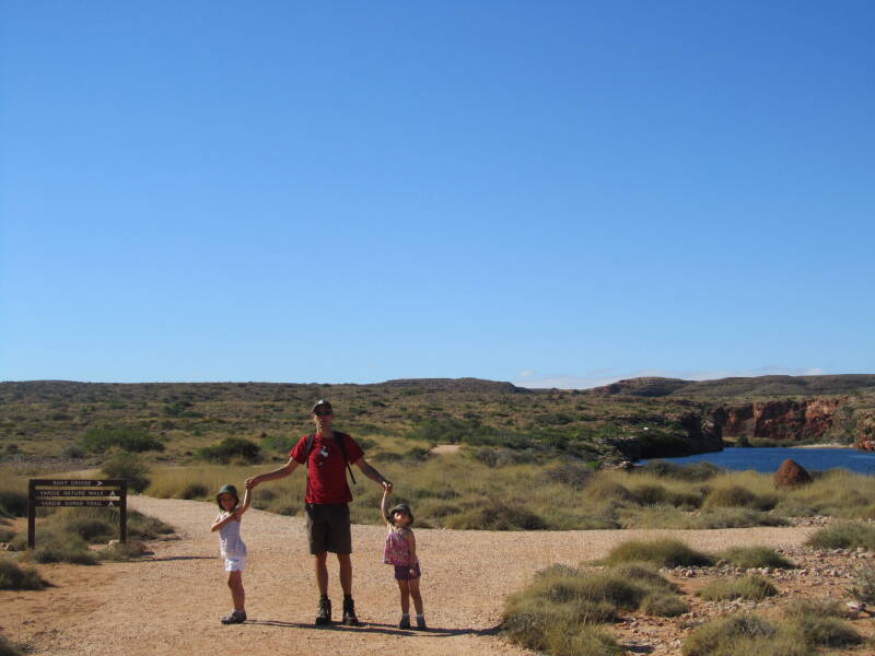 Kalbarri is een leuk stadje aan de monding van de Murchison River. Het nationale park bestaat uit de kliffenkust en de 80 km lange kloof die uitgesneden is door de Murchison rivier. De middagen brengen we door aan het strand, waar de meisjes heerlijk spelen in het rustige water van de riviermonding. De pelikanen komen meermaals hallo zeggen en de papegaaien bekijken ons vanuit de bomen. In het struikgewas treffen we ook een kanjer van een slang aan… ‘s Avonds eten we gezellig fish&chips in het dorpje.