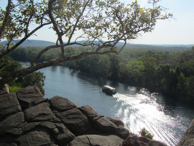 Het is gedaan met lange afstanden rijden. Vandaag is het slechts 50 km naar Jabiru, ook in Kakadu gelegen. Onder een loden zon verkennen we Ubirr met zijn vele aboriginal rotstekeningen. De meisjes vinden het leuk om de aangeduide figuren te zoeken en zijn helemaal weg van het verhaal van de regenboogslang.