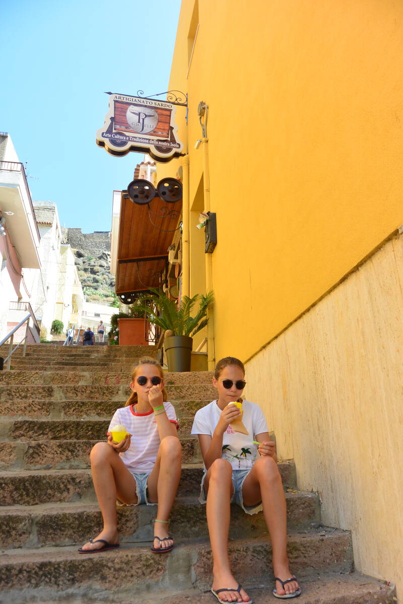 Op onze tweede dag in Sardinië bezoeken we Castelsardo, op 14 km van de camping gelegen. In de zomer plan je dit best in de voormiddag of late namiddag wegens de hitte. We parkeren beneden in de hoofdstraat en lopen te voet via de oude vestingmuur naar het middeleeuwse fort. Het is leuk slenteren in de smalle straatjes en een ijsje in Italië is altijd een goed idee.